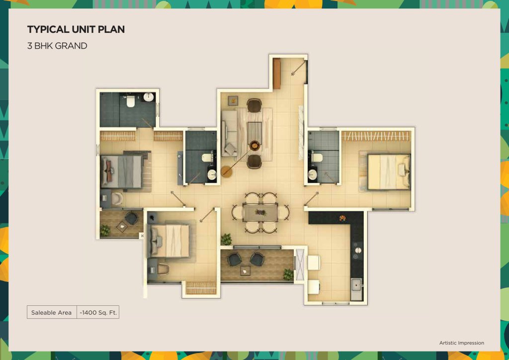 3 BHK 1400 Sq Ft Floor Plan